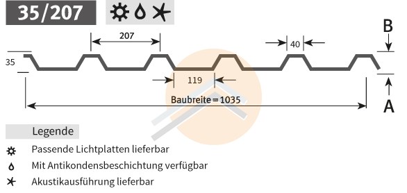 Das Trapezblech 35/207 ist das am häufigsten verwendete Profil in der Kategorie der "niedrigen" Profile. Dieses Profil ist vom Querschnitt und Sickenaufbau her traditionell gehalten und wird schon einige Jahrzehnte produziert und von den meisten Profilierern hergestellt. Das Trapezblech 35/207 ist in den gängisten RAL- Standardfarben, sowie in verschiedenen Stärken verfügbar. Einsatzmäßig wird dieses Profil mehrheitlich als wasserführende Oberschale, sowie als Decken- oder Wandverkleidung verwendet. Die Zahlen vom Trapezblech 35/207 bezeichnet die Profilhöhe (35 mm), den Hochsickenabstand (207 mm) diese wird von Mitte zu Mitte gemessen, sowie die Stahlstärke (z.B. 0,75 mm).